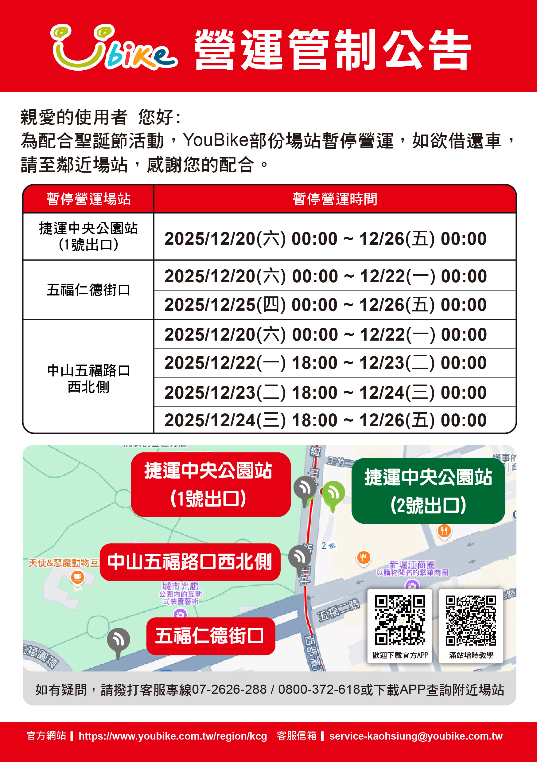2025高雄YouBike 因配合中央公園聖誕節活動暫停營運場站公告