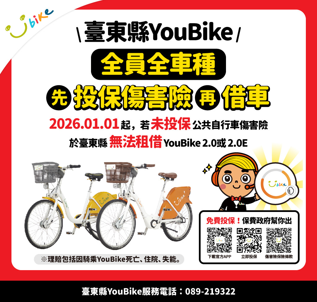 自2026/01/01(四)起,YouBike會員及單次租車(臨時會員) 若未投保免費的公共自行車傷害險,於臺東縣無法租借YouBike 2.0&2.0E,提醒您,請盡速透過官網或官方APP登入會員免費投保。