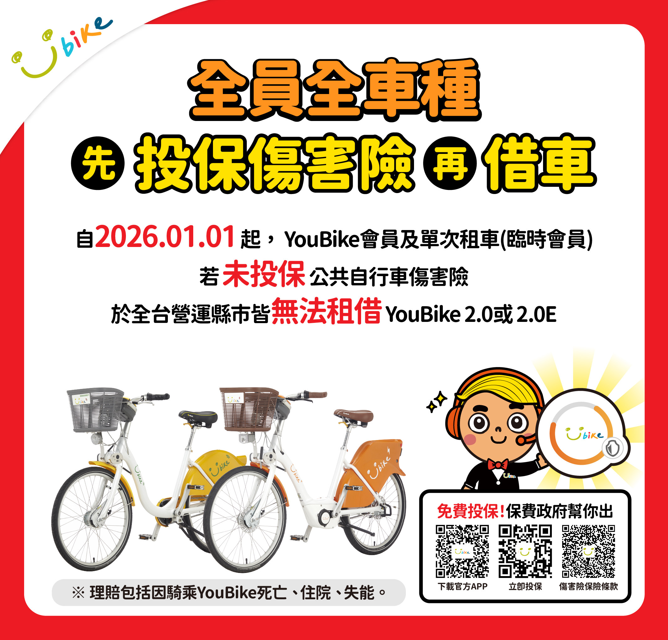 2026/01/01(四)起,YouBike會員及單次租車(臨時會員) 若未投保免費的公共自行車傷害險,於全台營運縣市皆無法租借YouBike 2.0&2.0E,提醒您,請盡速透過官網或官方APP登入會員免費投保。