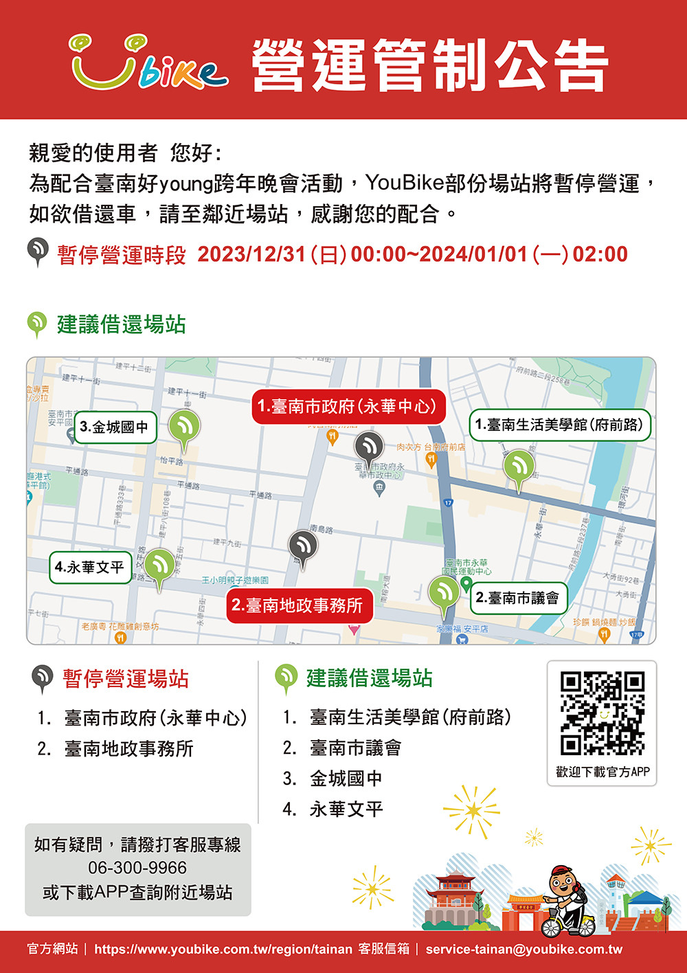 配合台南好young跨年晚會交通管制,YouBike部分場站將暫停營運,如欲借還車請至鄰近場站,感謝您的配合。