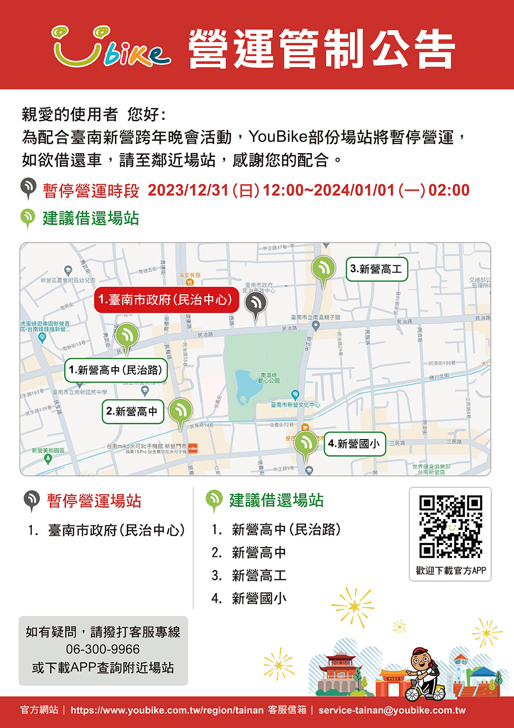 配合新營跨年演唱會交通管制,YouBike部分場站將暫停營運,如欲借還車請至鄰近場站,感謝您的配合。