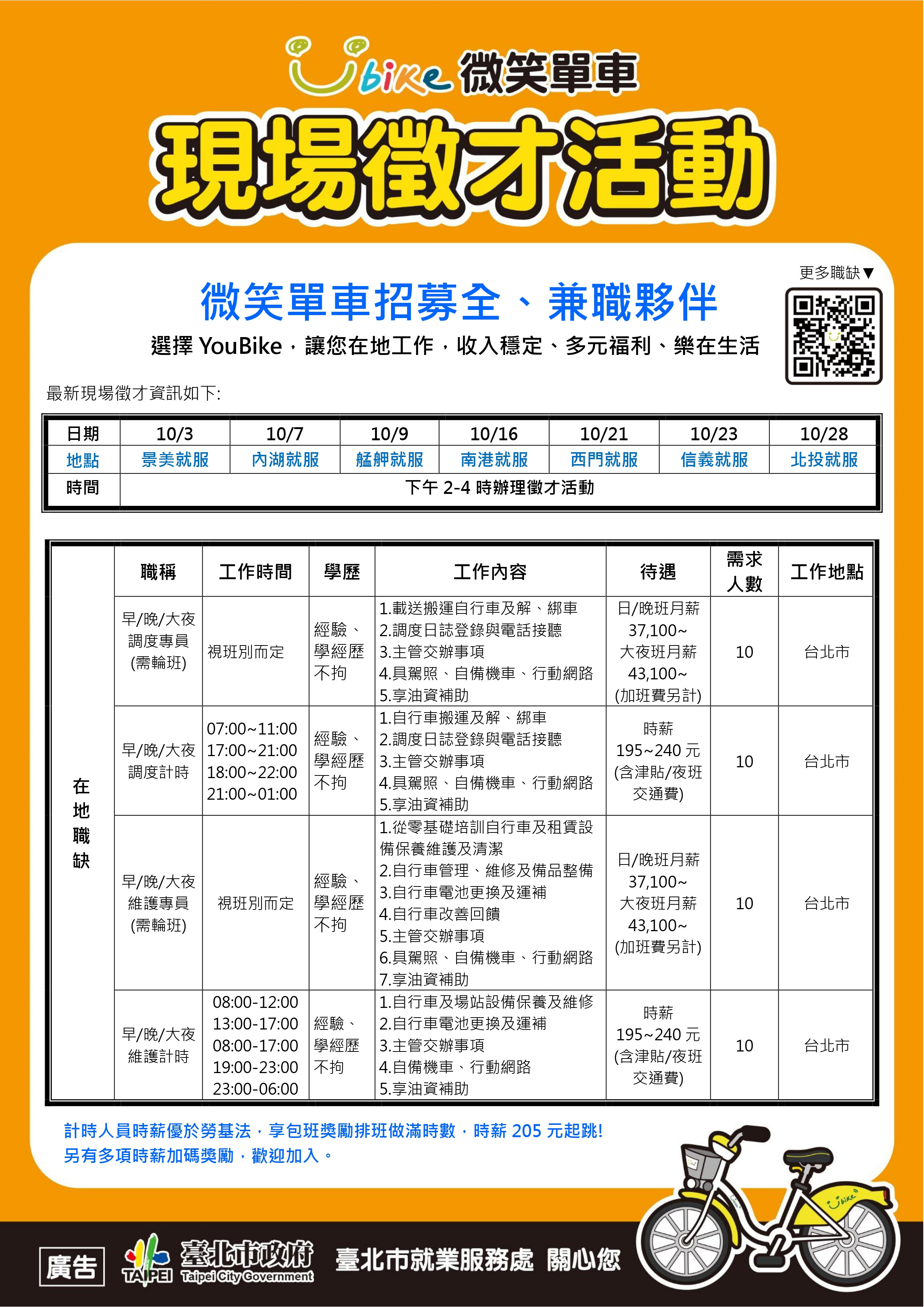 YouBike團隊持續擴大招募中!;內勤職缺我們提供團隊持續成長的機會與舞台,無論你擅長企劃、策略規劃,甚至技術開發,只要對綠色運輸有興趣,YouBike都期待你的加入,和我們一起茁壯。👉 企劃專員:連結👉 機電創新研發工程師:連結; ;👉 技術開發整合工程師:連結;🔎 點我看更多職缺:連結 ;;營運職缺台北市在地職缺10月份現場面談陸續開跑!我們會出現在各就業服務站,快來和我們聊聊,履歷再也不怕石沉大海,工作就在眼前!;;;