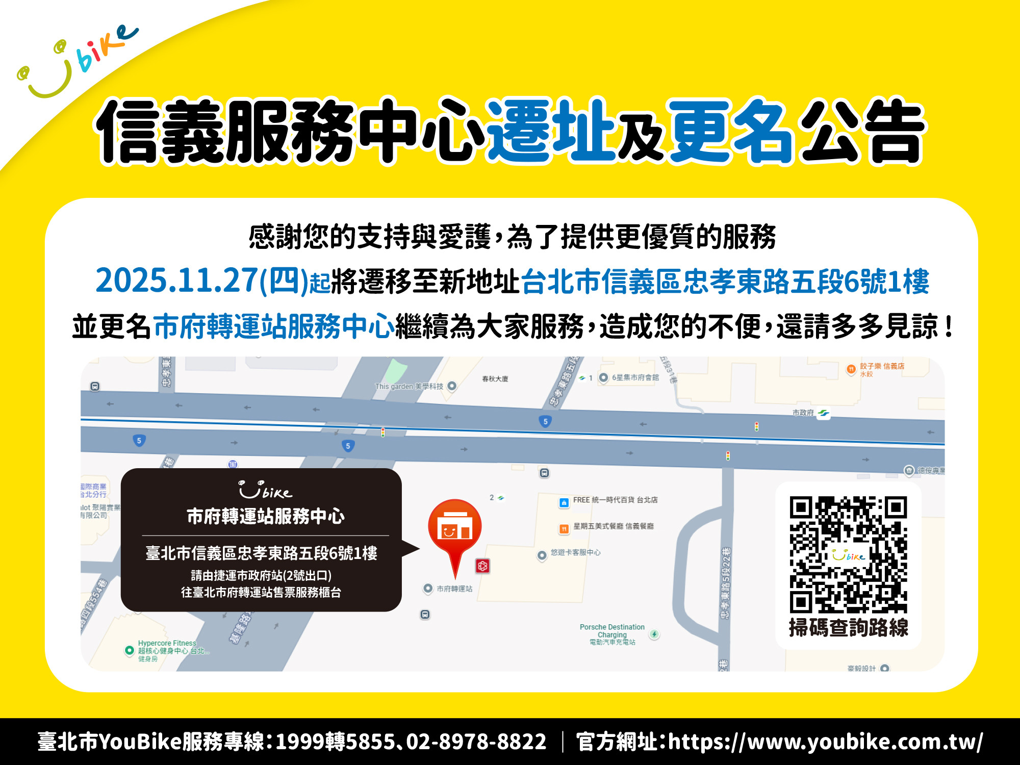 臺北市 YouBike 信義服務中心預計於2025/11/27(四)搬遷至新址,並更名為「市府轉運站服務中心」,造成您的不便,敬請見諒。