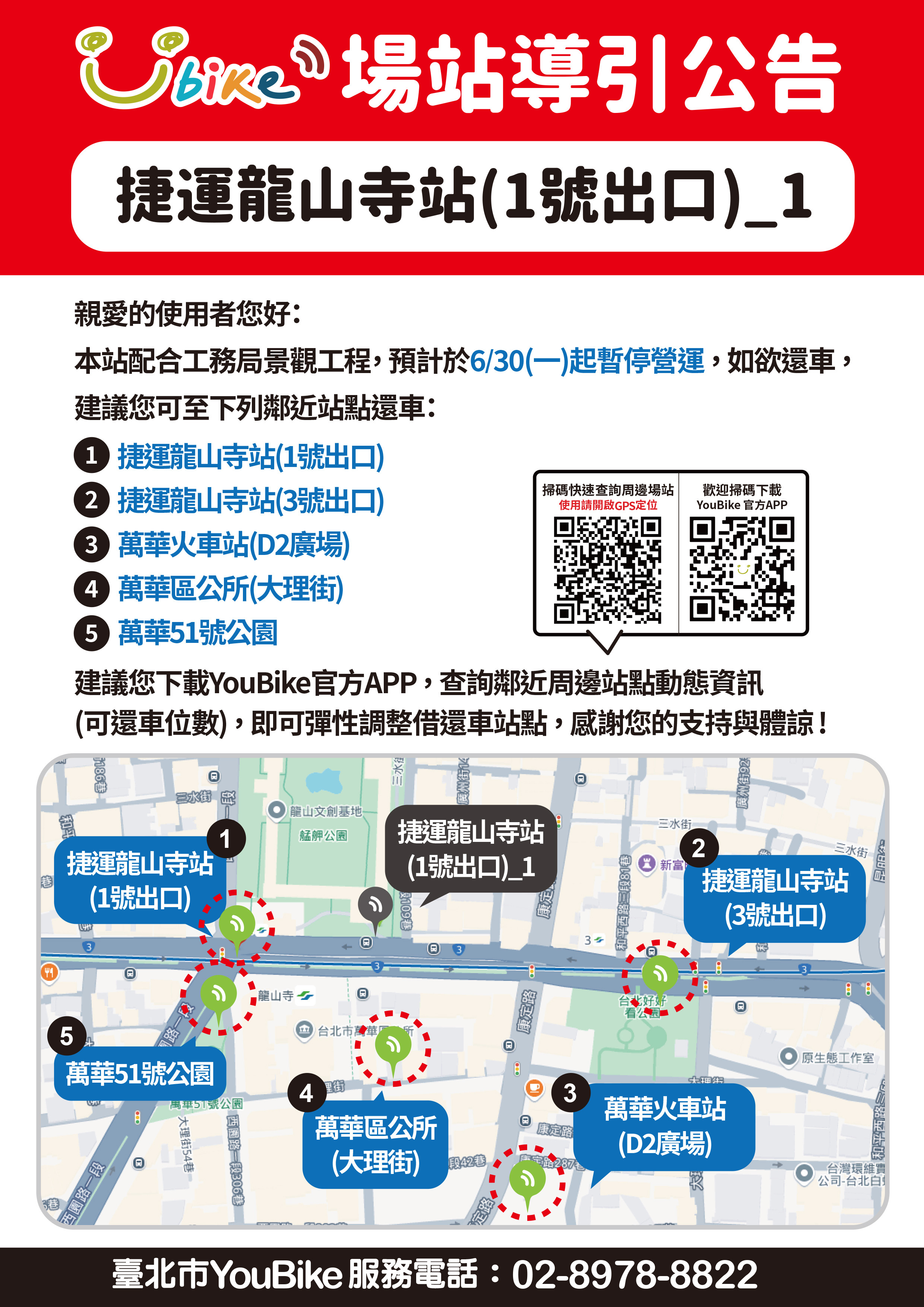 為配合工務局景觀工程,2025/06/30 (一) 00:00 起 台北市 萬華區『捷運龍山寺站(1號出口)_1』將暫停營運,無法提供借還車服務。造成您的不便,敬請見諒。