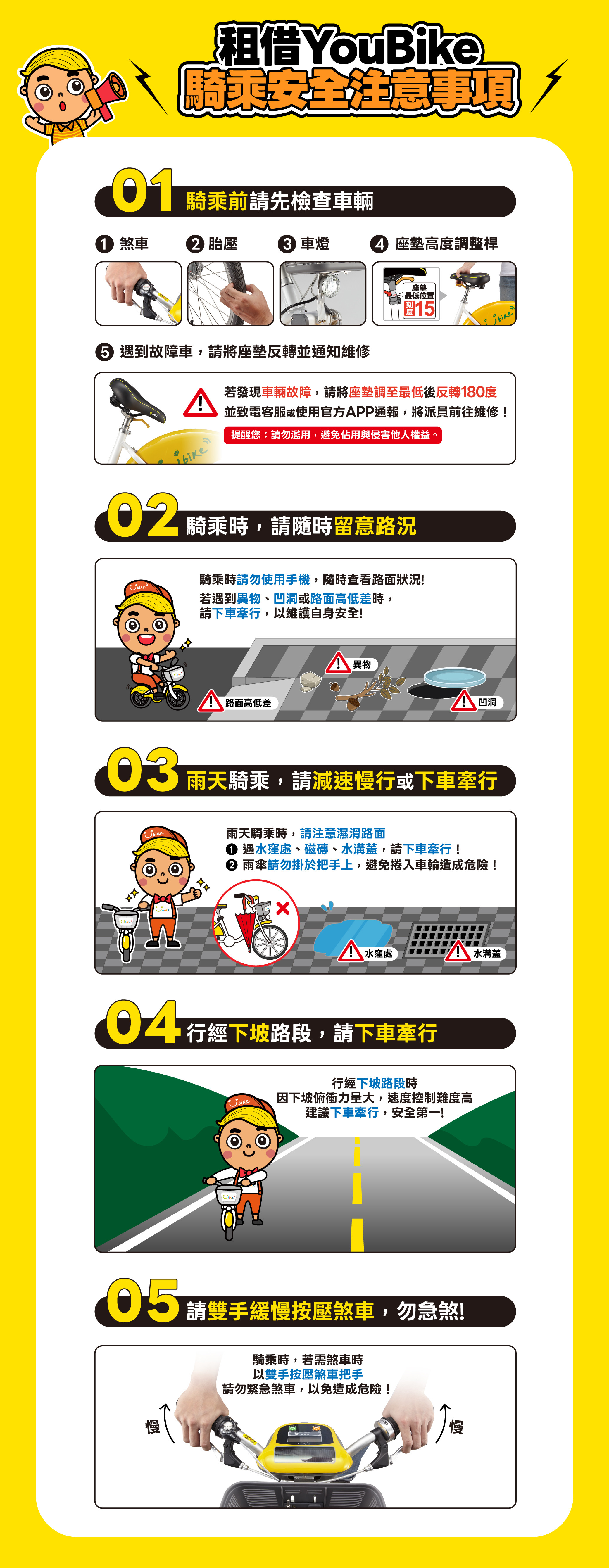 ➎ 遇到故障車時,請先將座墊反轉180度,並可致電客服(連結)或使用官方APP的故障通報,將派員前往維修!